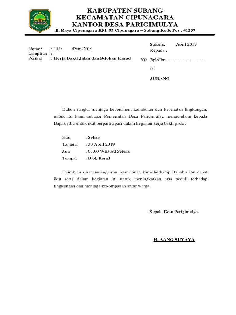 Ikut berpartisipasi dalam kedatangan bangsa eropa ke indonesia. Kerja bakti adalah suata sarana kebersamaan antar warga guna membantu tercapainya kenyamanan desa dengan melakukan pemba. Demikian surat undangan ini dibuat untuk diketahui dan maklim adanya, atas perhatian dan kerja sama yang baik dari seluruh lingkungan jarakan warga rt 03 rw. Boleh berfoto sambil bekerja bakti. Pada format ini pembuatan surat undangan.